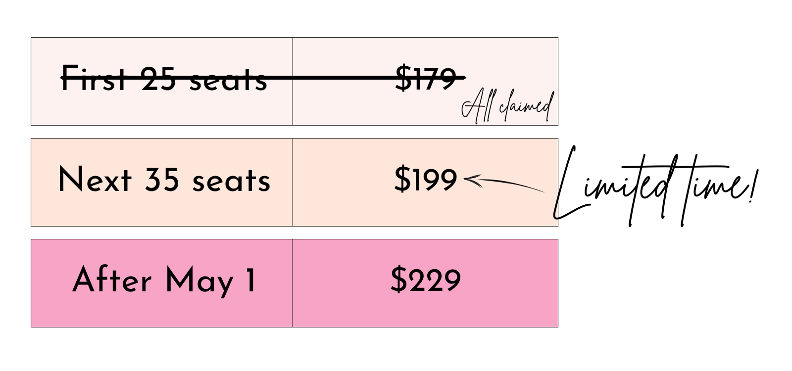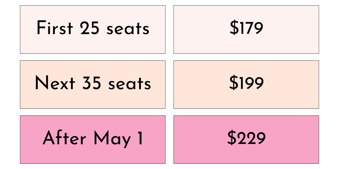 Once the initial registration window closes- or once early seats are filled- pricing moves to the next tier.